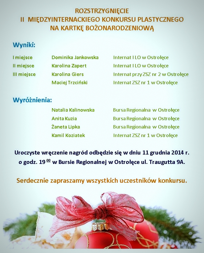 ROZSTRZYGNIĘCIE II MIĘDZYINTERNACKIEGO KONKURSU PLASTYCZNEGO NA KARTKĘ BOŻONARODZENIOWĄ Posted on 10 grudnia, 2014 by admin